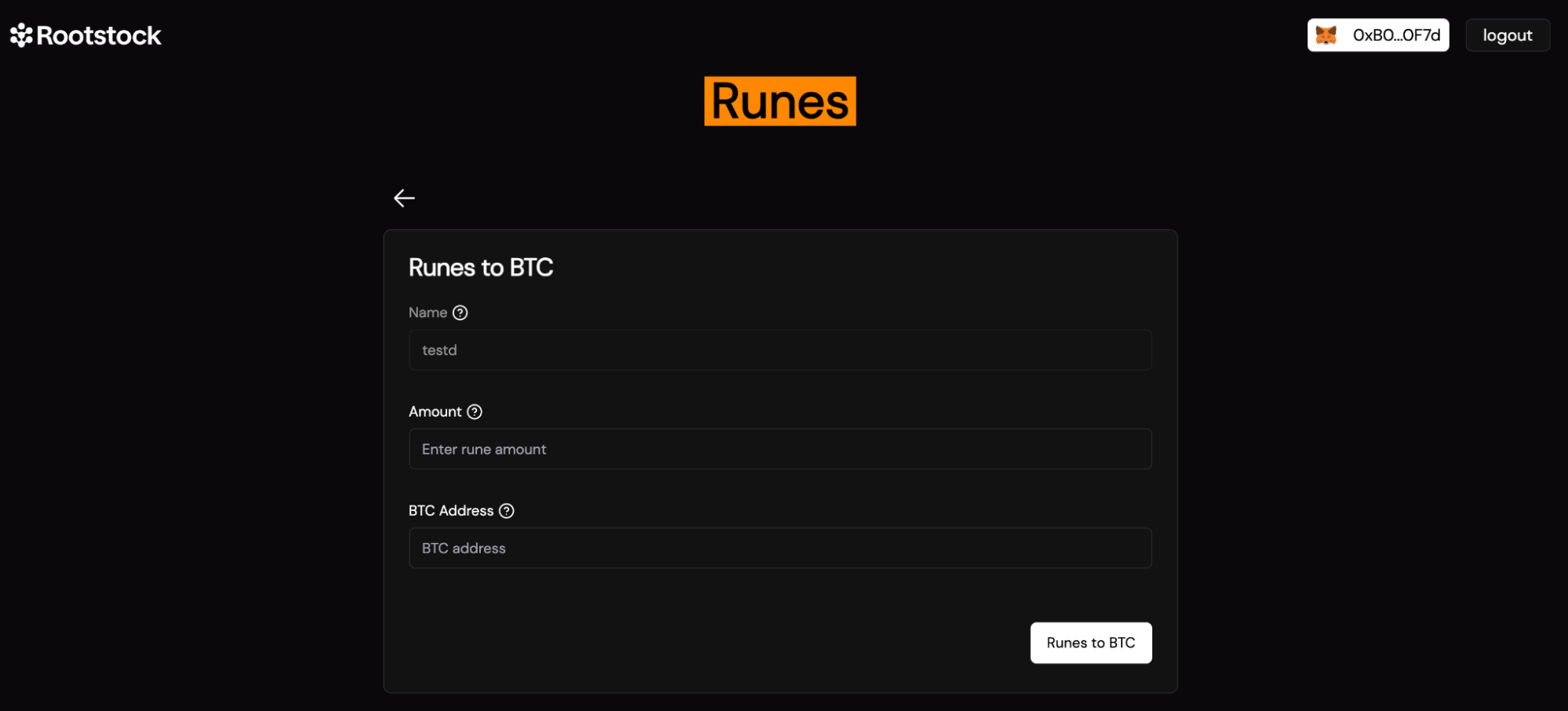 - After filling in the details, click on the "Runes to BTC" button to initiate the bridging process.