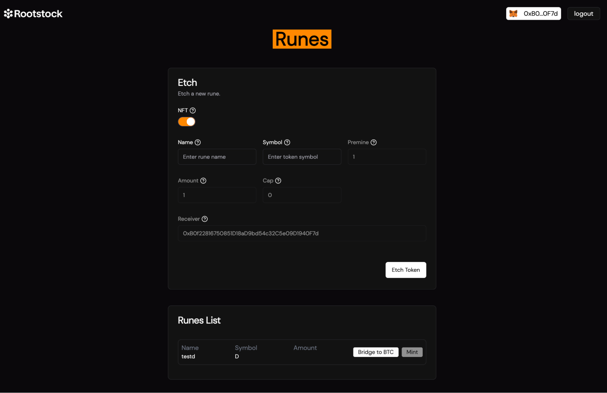 - Description: This will automatically fetch your Rootstock wallet address where the minted runes will be sent.